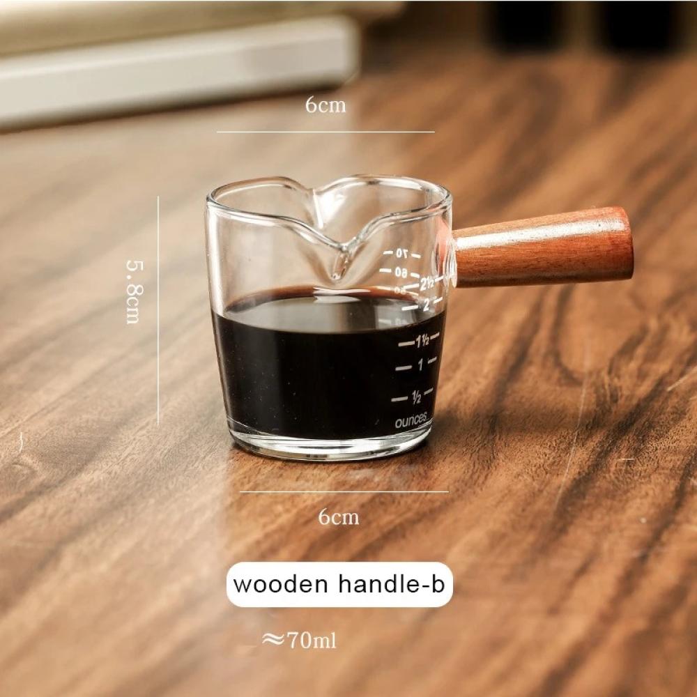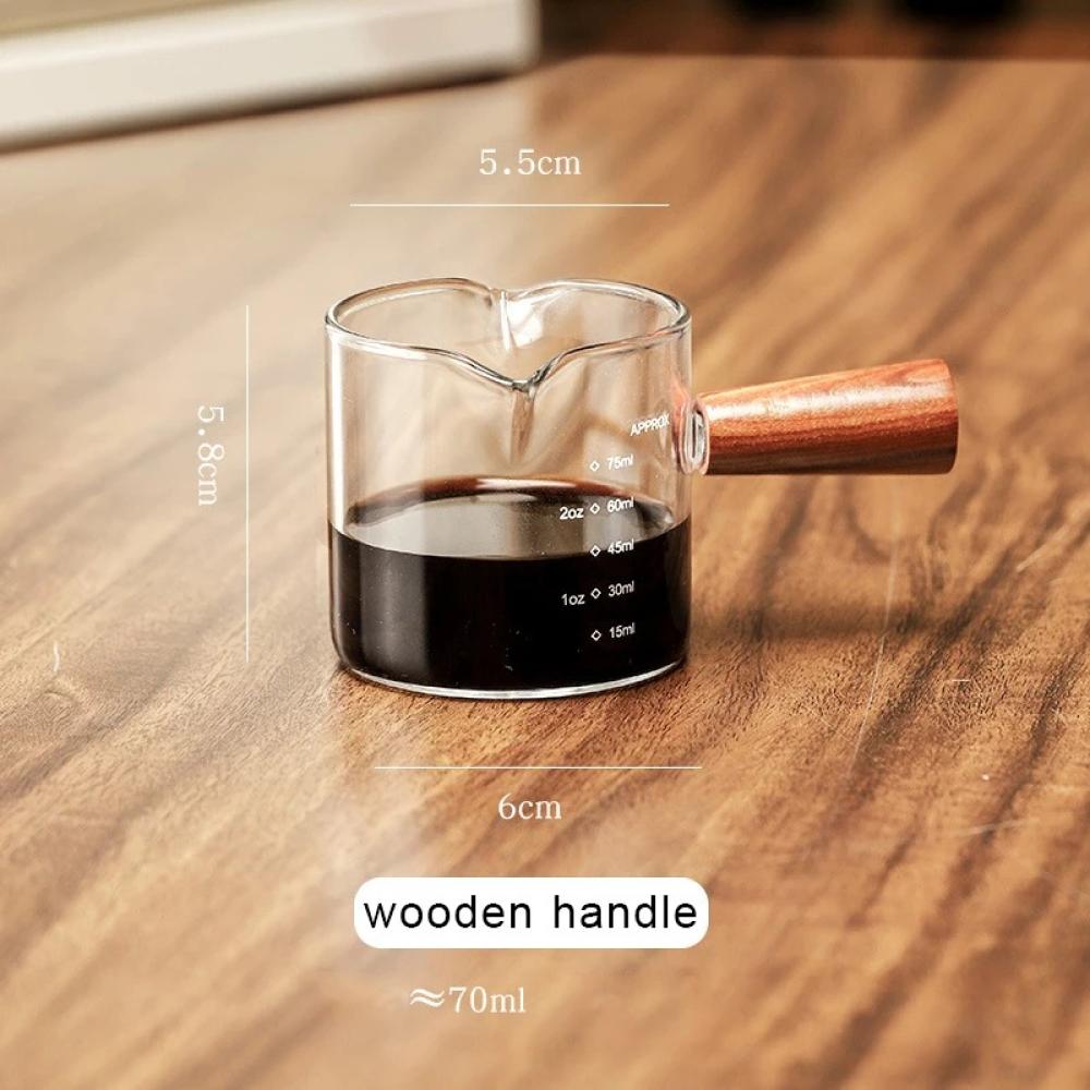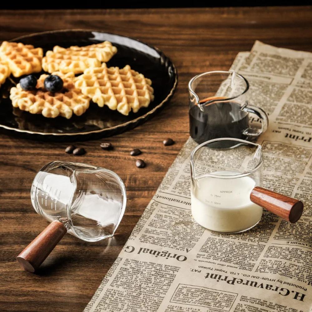 قياس كوب زجاجي إبريق الحليب مع يد خشبية هو الأداة المثالية لتحضير الحليب في فنجان القهوة أو المشروبات المفضلة لديك. بفضل تصميمه الشفاف ويديه الخشبية المريحة، يضمن لك تجربة استخدام مريحة وأنيقة أثناء تحضير الحليب أو القهوة.